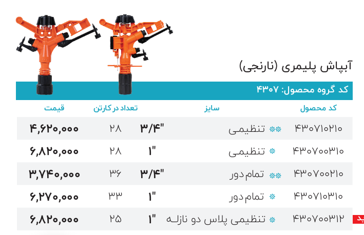 جنس بدنه ی محصول پلیمری و در سه نوع تمام دور، تنظیمی و تنظیمی پلاس دو نازله موجود میباشد. سفارش به صورت کارتنی مقدور است. تاریخ به روز رسانی قیمت ۱۴٠۵/٠۱/٠۸ است.